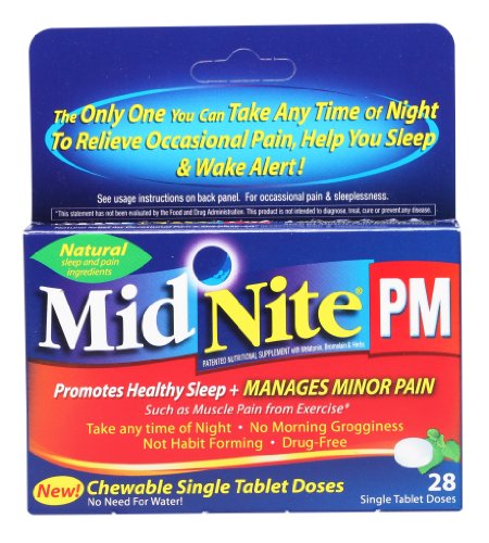 MidNite PM is the safe and natural way to help relieve occasional minor pain and relax you to sleep using a blend of herbs and natural ingredients. Even minor pain such as muscle pain from exercise can keep you from falling asleep or wake you in the night. Now there's a natural choice. MidNite PM with all natural pain and sleep ingredients is so unique, it's patented. Following usage instructions, MidNite PM is the only remedy for occasional pain and sleeplessness that can be taken any time of night - before going to sleep or even in the middle of the night - with no morning grogginess. The ingredients in MidNite are safe, effective and not habit forming. Now chewable Single Dose tablets! Keep MidNite by your bedside.